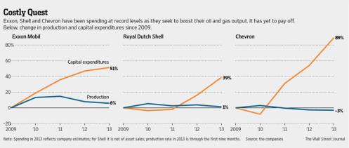 Tässä jätetään huomiotta eräs aika olennainen seikka. Yhtiöt ovat vetäytymässä hankkeista myös koska niiden investointikyky ei yksinkertaisesti riitä. Vaikeampien alueiden öljy erittäin kallista kehittää. Wall Street Journalin otsikoinnin mukaan isot kansainväliset öljy-yhtiöt ovat viime aikoina kasvattaneet investointejaan valtavasti (oletettavasti tuon kotipihan öljyn tuottamiseen) mutta tuotanto ei ole silti hirveästi kasvanut. On huolestuttavaa mikäli nykyisetkään öljyn hinnat, joilla teollisuusmaiden taloudet hoippuvat nollakasvussa ja tyrmäyksen partaalla, eivät riitä tämän suurempaan lisätuotantoon. Alla vielä kuva investointien ja tuotannon kasvun suhteesta, jossa käyrät tuntuvat suuntautuvan intuition vastaisesti. Erityisesti Chevronin käppyrä on pysäyttävä. Ehkä tilanne muuttuu kun uusia hankkeita saadaan tuotantoon? Toisaalta erityisesti liuskeöljy on nopeaa ottaa tuotantoon, joten jos rahat ovat menneet siihen, niin ei hyvältä näytä.