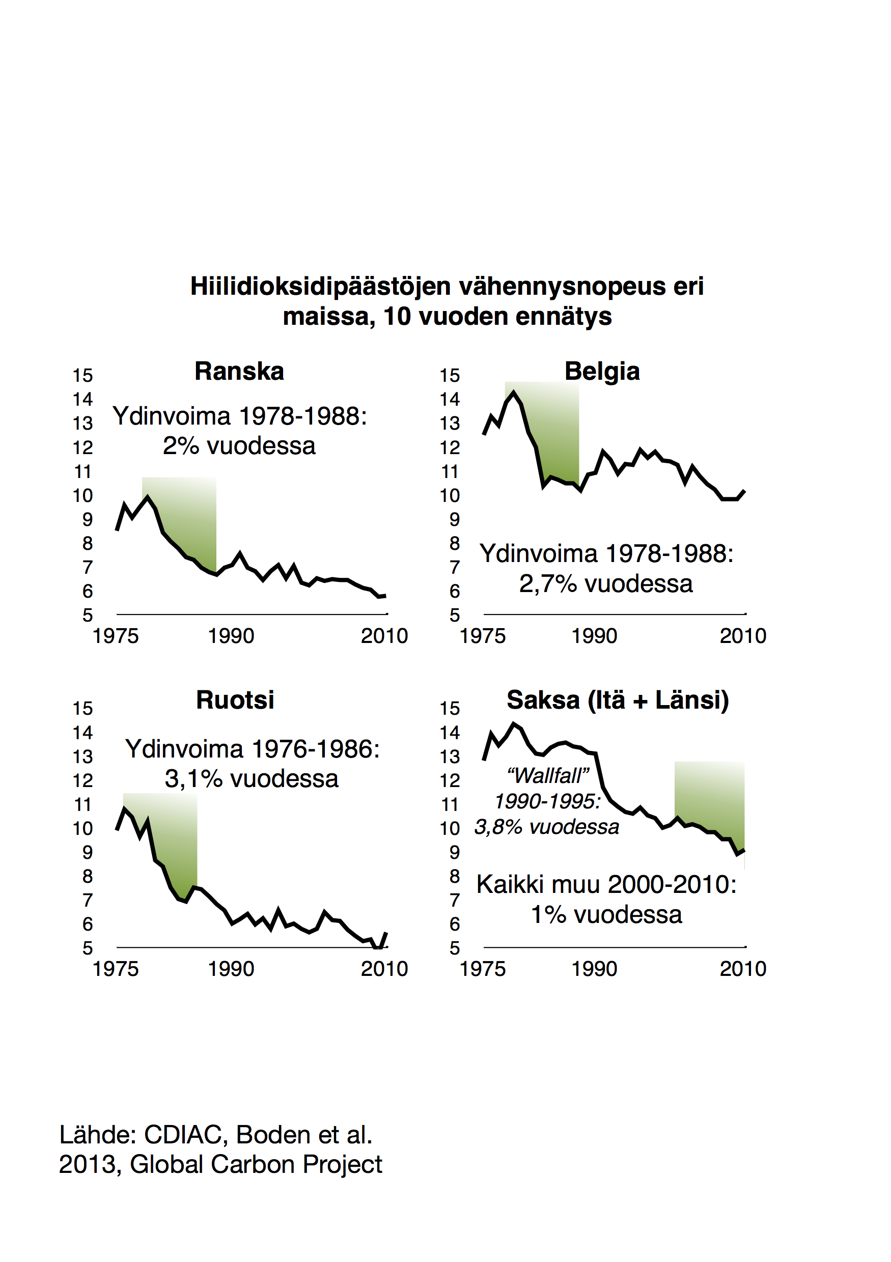 Ydinvoimaa rakentaneet maat vähensivät sähköntuotannon päästönsä pääosin jo 1970 ja 1980 luvuilla. Tutkimuksen tehnyt B. Sovacool (joka on tunnettu kirsikoita poimivasta ydinvoimavastaisesta tutkimuksesta*) jätti tämän täysin huomiotta: ne maat jotka ydinvoimaan satsasivat vähemmän, vähentävät nyt niitä samoja ”helppoja” päästöjä jotka ydinvoimaa rakentaneet maat vähensivät jo vuosikymmeniä sitten. Hyvä esimerkki tästä on Saksa: Saksa tavoittelee pääsevänsä sähköntuotannon päästöjen osalta vuonna 2050 tilanteeseen, johon Ranska pääsi jo 1990 (80 % päästötöntä). Tätä Saksan ilmastopolitiikkaa pidetään yleisesti todella edistyksellisenä ja kunnianhimoisena.