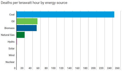 The thing about the numbers in that graph is that they include, to the best ability of the researchers and authors (dozens of international, multidisciplinary teams working for many years in the Externe-study for example), the entire fuel chain from mining to transporting to fuel fabrication and so forth, the reactors being built and operated, the possibility/likelihood of severe accidents, the dismantling of the reactors and the final disposing of the radioactive waste for up to 100,000 years, and so forth. With all those included, nuclear is still pretty much the safest way to make energy.