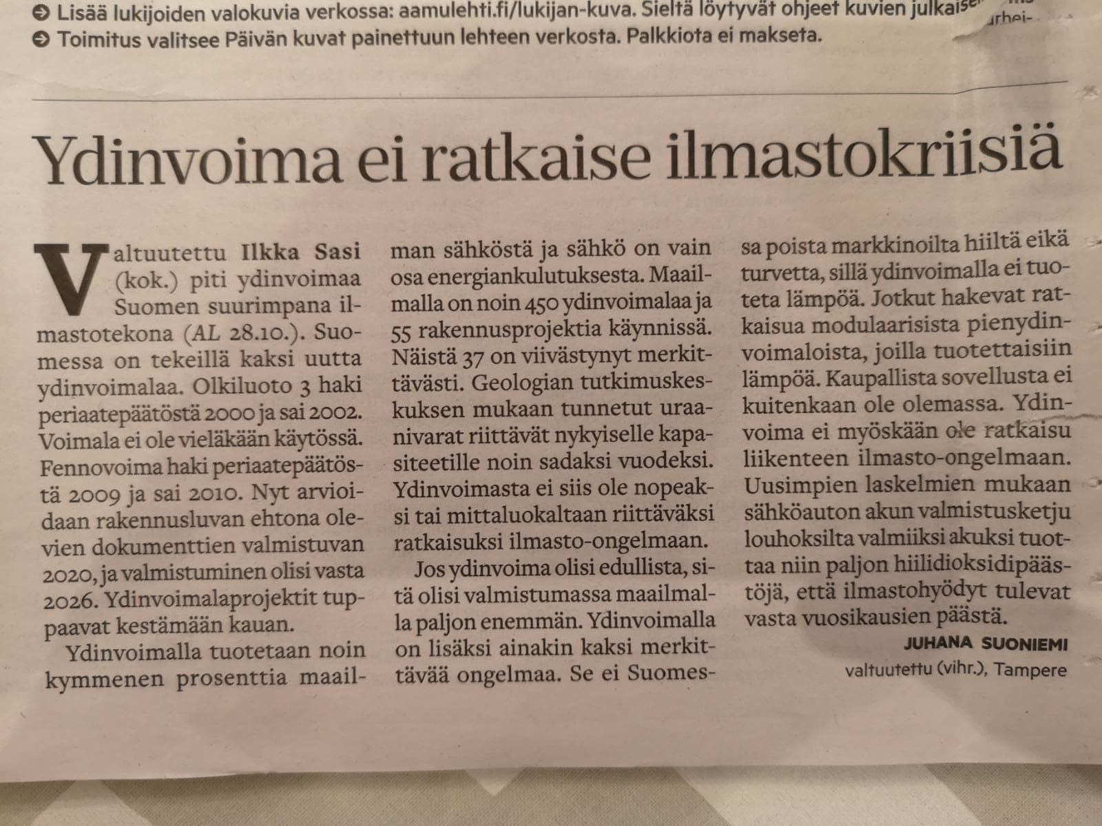 Vihreiden Tampereen valtuutettu Juhana Suoniemi kirjoitti äskettäin Aamulehden mielipidepalstalla otsikolla, ”Ydinvoima ei ratkaise ilmastokriisiä.”